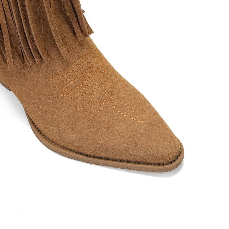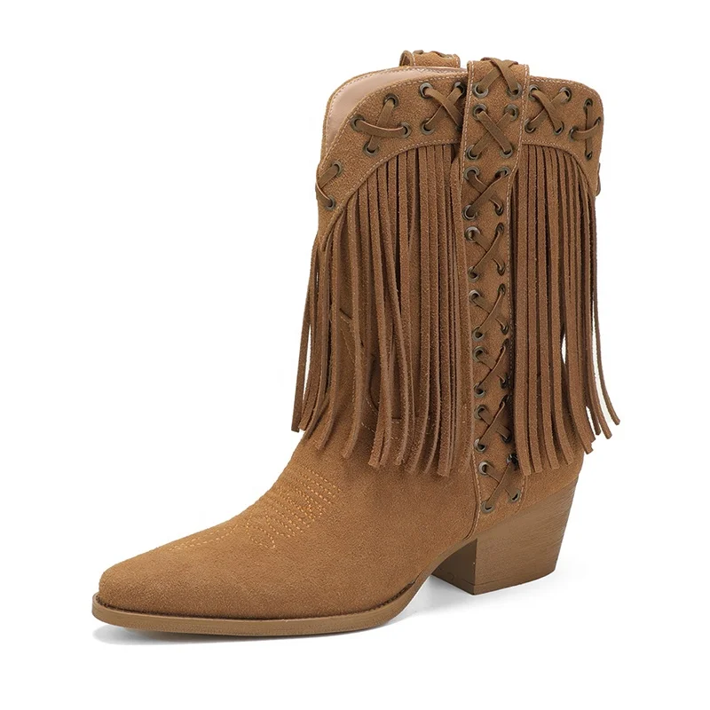 Women's Western Faux Suede Fringe Cowboy Boots Mid-Calf Pointed Toe Lace-Up Embellishment Autumn/Winter Comfort